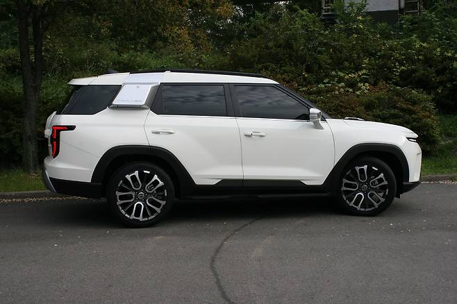 측면부는 우선 휠하우스의 볼륨감이 크다. 검정 우레탄 재질의 휠하우스 크레들 적용으로 강인한 오프로드 SUV를 강조했다. 휠은 다이아몬드 컷팅 20인치 휠이고, 타이어는 넥센의 로디안 GTX 245/45/R20 사이즈가 장착됐다. 도어핸들은 버튼 타입인데 상품성 측면에서 1열만 적용된 점이 아쉽다. 조수석 C필러에 사이드 스토리지 박스는 유럽산 SUV에 적용한 스토리지와 유사하다. 루프라인이 A필러에서 높아지다 C필러에서 한번 꺾여 낮아지는 것은 디자인 의도로 보인다.