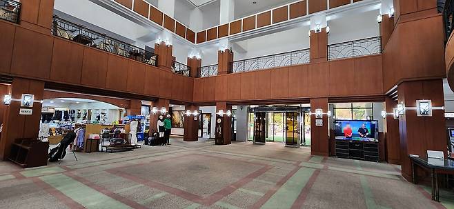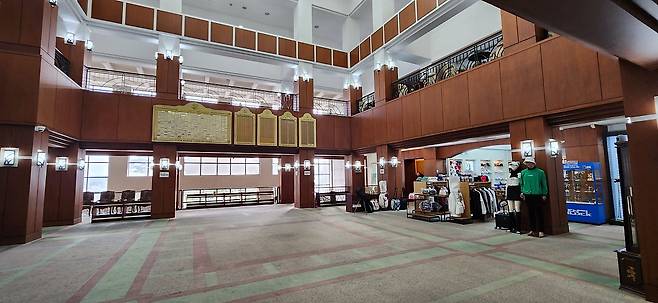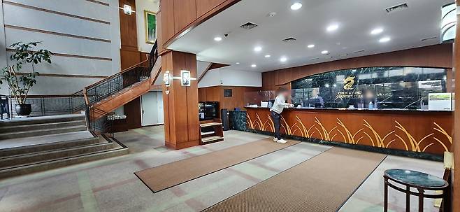 주차장에서 들어선 클럽하우스의 첫 모습은 간단한 프런트만 있습니다. 실제 로비는 왼쪽 계단으로 한층 올라가야 합니다.