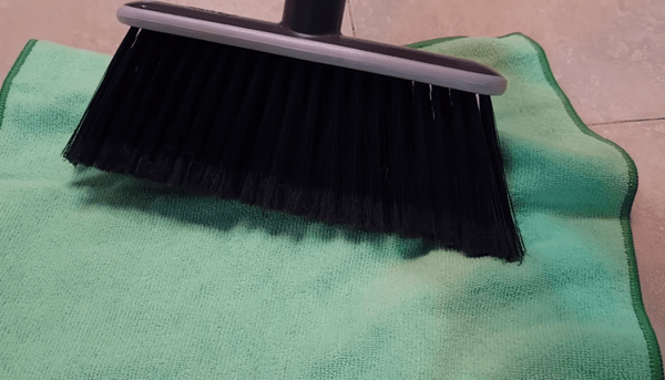 카펫 가장자리 빗자루 들어가지 않는 골칫거리? 수건 감싼 빗자루로 쓸면 털 사이 먼지 완벽 포집. 한국 겨울 명절 총청소 필수.