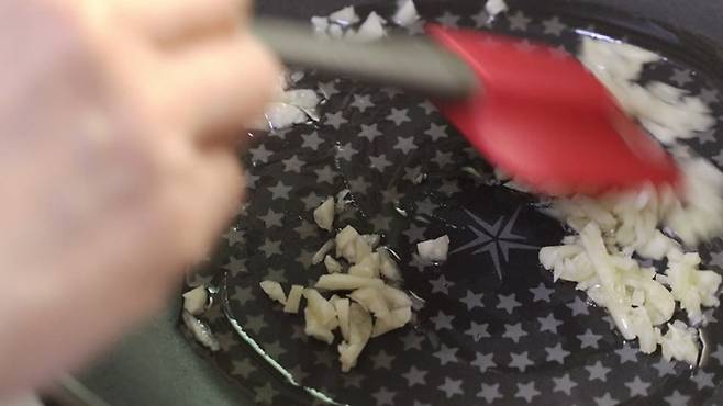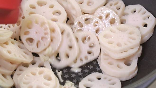 '중불' 프라이팬에 식용유를 약간 두른 후, 마늘을 먼저 넣어 볶아 주세요. 이렇게 마늘향이 살살 올라올 때 연근을 함께 넣고 볶아 주세요. 연근은 1분 정도 볶아 주세요.