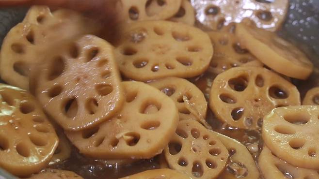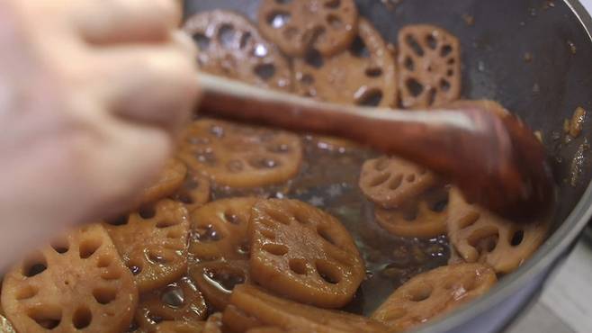 국물이 어느 정도 졸여졌을 때 물엿을 넣어 주세요. 물엿이 들어가야 윤이 나면서 달짝지근한 맛이 함께 올라와 더욱 맛있게 즐길 수 있어요. 물엿을 함께 넣고 연근조림을 만들어 주세요.