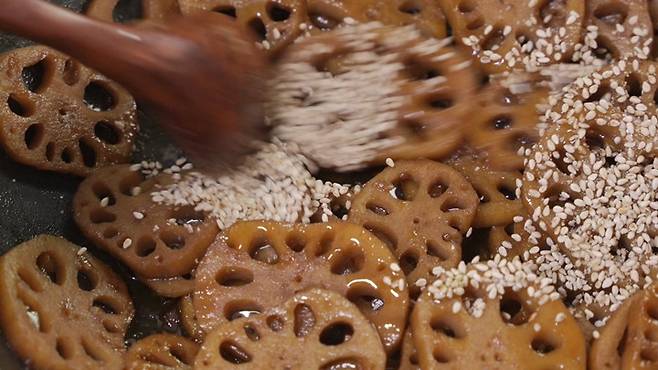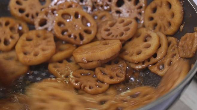 국물이 어느 정도 졸여졌을 때 물엿을 넣어 주세요. 물엿이 들어가야 윤이 나면서 달짝지근한 맛이 함께 올라와 더욱 맛있게 즐길 수 있어요. 물엿을 함께 넣고 연근조림을 만들어 주세요.