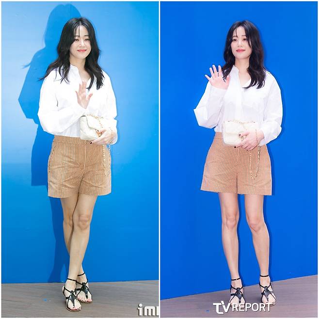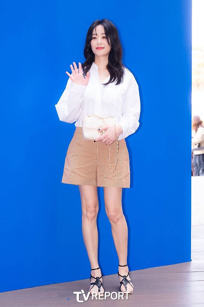 김효진은 클래식한 화이트 셔츠와 감각적인 패턴의 쇼츠를 조합해 깔끔하면서도 트렌디한 분위기를 연출했습니다.