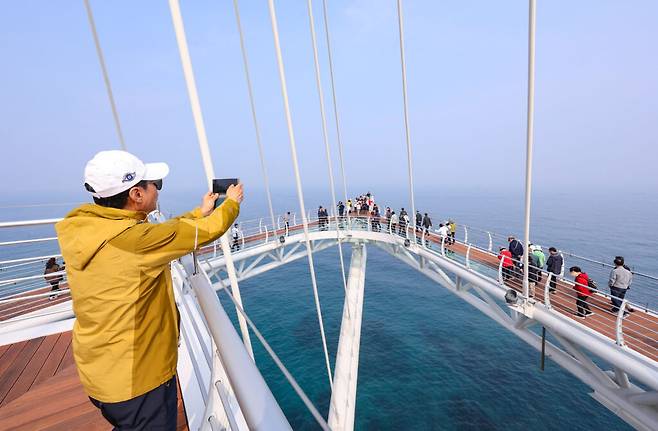 길이 100m, 지상 높이 77m에 달하는 이 전망 시설은 단순한 전망대가 아니다. 발아래를 투명 유리 데크로 가득 채워, 마치 동해 수면 위를 두 발로 디디며 걷는 듯한 감각을 선사한다.