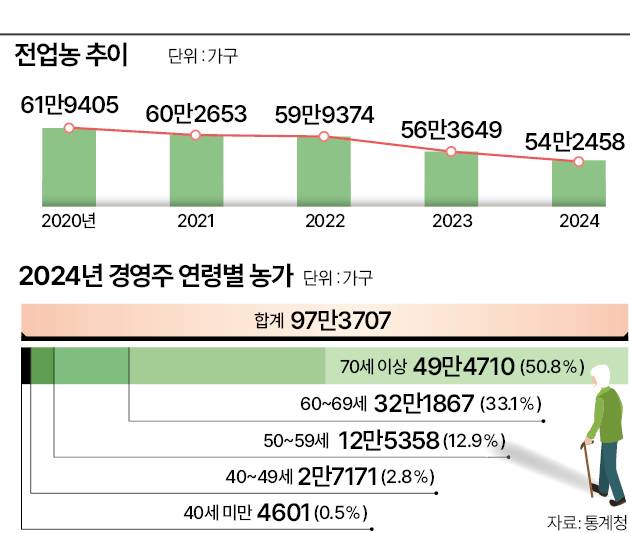 농가 고령화도 심각하다. 지난해 농가 경영주 가운데 70세 이상 비중이 50.8%를 기록하며 처음으로 과반수를 차지했다. 이같은 농가는 49만4710가구로 2023년(47만7323가구)보다 3.6% 증가했다. 이들을 제외하면 경영주 나이를 기준으로 ▲40∼49세(2만7171가구) ▲50∼59세(12만5358가구) ▲60∼69세(32만1867가구) 등 모든 연령대의 농가는 전년보다 감소했다. 특히 경영주가 40세 미만인 청년농가는 2020년 1만2426가구를 기록한 이후 매년 눈에 띄게 쪼그라들어 2024년에는 4601가구로 내려앉았다. 4년 만에 3분의 2 가까이 줄면서 역대 최저치를 찍었다.