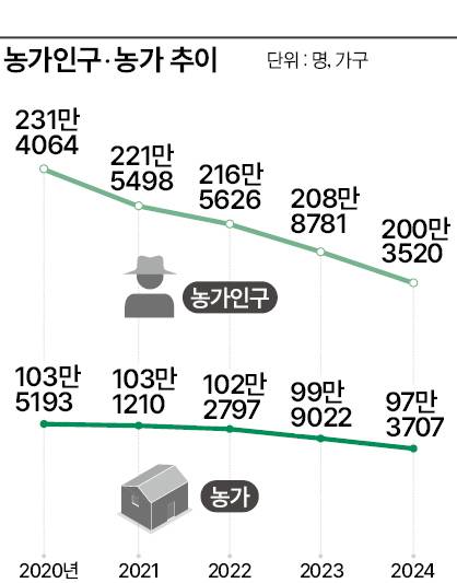 2023년 99만9022가구였던 농가수는 100만가구를 회복하지 못한 채 하향곡선을 유지했다. 지난해 97만3707가구로 규모가 더 줄었다.