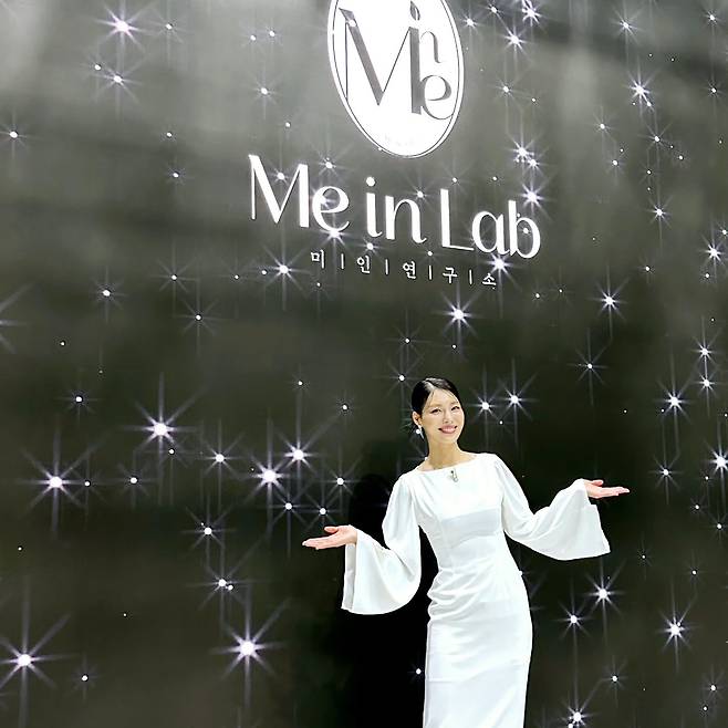 'Me in Lab' 로고를 배경으로 한 김정화는 플레어 소매가 특징인 화이트 드레스로 고급스러운 분위기를 연출하고 있다. 보트넥 디자인과 벨 슬리브가 클래식한 페미닌 룩을 완성하고 있으며, 전체적으로 깔끔하고 단아한 이미지로 품격 있는 스타일링을 보여주고 있다.##