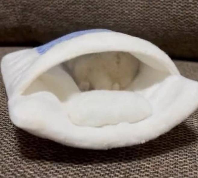 햄스터는 자기 이불을 보자마자 그대로 질주해 들어갔습니다. 아무래도 자기 이불에 들어가고 싶은 욕구를 제어할 수 없었던 모양입니다.
