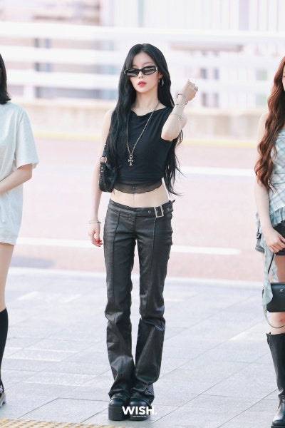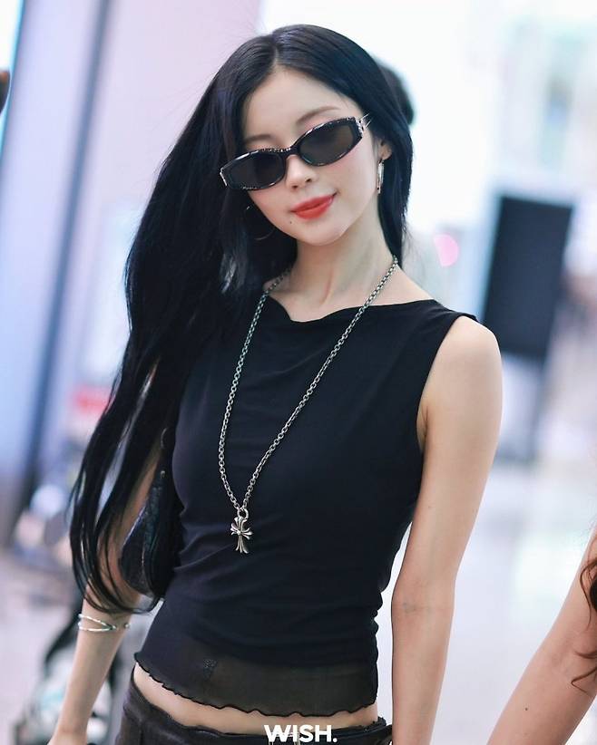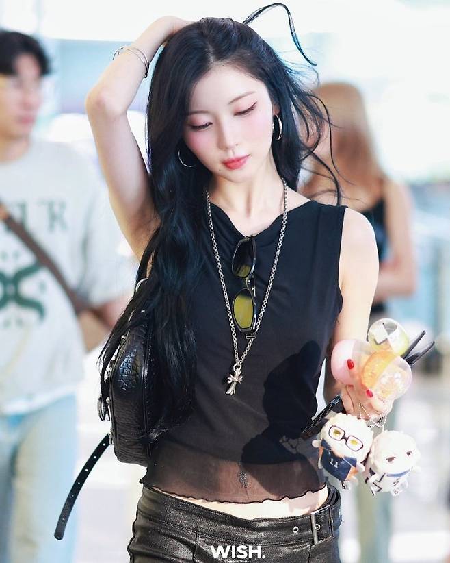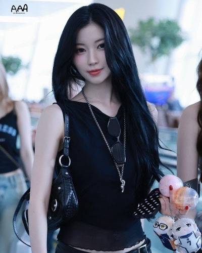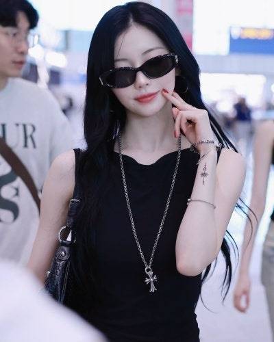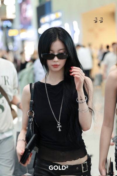 아사는 긴 흑발 머리에 메시 소재의 민소매 크롭탑과 가죽 팬츠를 매치하여 하얀 피부를 더욱 돋보이게 하는 스타일을 연출했습니다. 여기에 블랙 선글라스와 크롬하츠 실버 목걸이를 착용하여 룩에 포인트를 더했는데요. 선글라스 템플 또한 실버 컬러의 메탈 소재로 통일감을 주어 블랙 & 실버 컨셉을 완벽하게 소화했습니다. 아사의 센스 넘치는 스타일링은 공항을 순식간에 패션쇼 현장으로 만들었습니다.