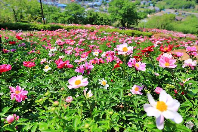 경상남도 창녕군 영산읍에 위치한 함박공원은 지금 붉고 화사한 작약꽃이 만개한 시기를 맞이하고 있습니다.
