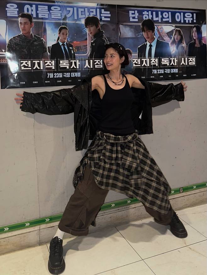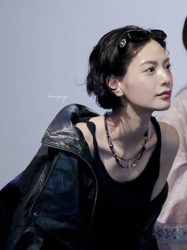 민소매에 가죽자켓, 체크 남방으로 힙하고 그녀만의 스타일로 소화했는데 그냥 존예네요 ^^