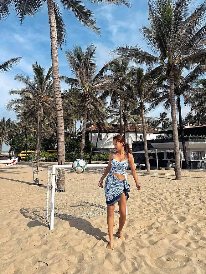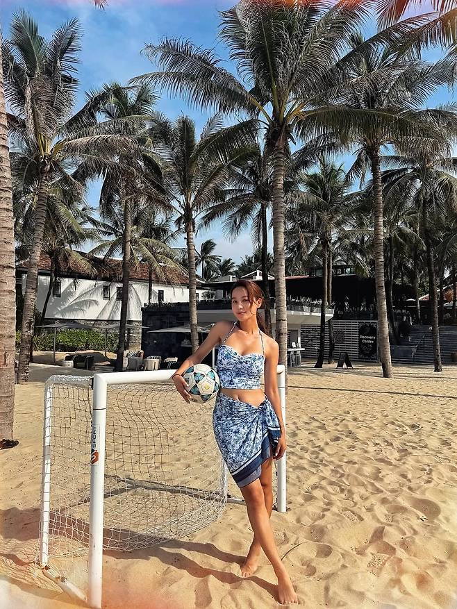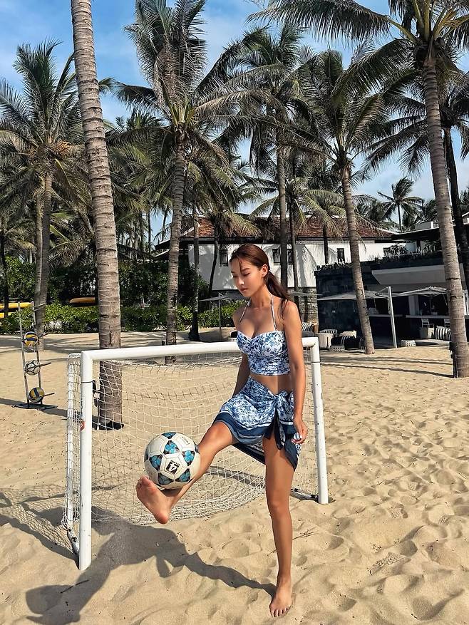사진 속 그는 플라워 패턴의 투피스 수영복을 입고 미니 골대 앞에서 축구공을 트래핑하는 여유로운 포즈, 그리고 해변에 앉아 자연스럽게 미소 짓는 모습 등 다양한 각도로 건강미를 발산한다.