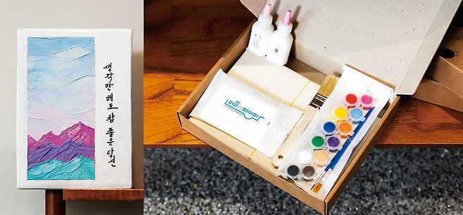 대표적인 제품은 ‘페이퍼캔버스’입니다. 폐박스를 가로 23㎝, 세로 16㎝로 자른 뒤 겹겹이 쌓은 후 천을 붙여 씌워 그림을 그릴 수 있는 캔버스를 만듭니다. 이렇게 만든 페이퍼캔버스에 재능 기부 작가가 그림을 그리거나 캘리그래피(멋글씨)를 쓴 ‘페이퍼캔버스 아트’, 직접 페이퍼캔버스를 만들어볼 수 있는 DIY키트 등도 제작·판매 중입니다. 그 수익을 어르신들의 생계와 안전, 여가를 지원하는 데 쓰고 있습니다.
