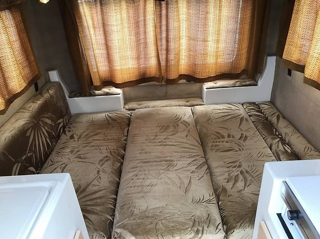 밤에는 다이닝 공간이 침대로 전환됐다. 이는 여행용 트레일러에서 볼 수 있는 일반적인 레이아웃이지만, 이렇게 작은 차량에도 가능하다는 점은 상당히 놀랍다. 카펫 바닥, 덮개가 있는 좌석, 필수 커튼은 집 같은 분위기를 연출한다.