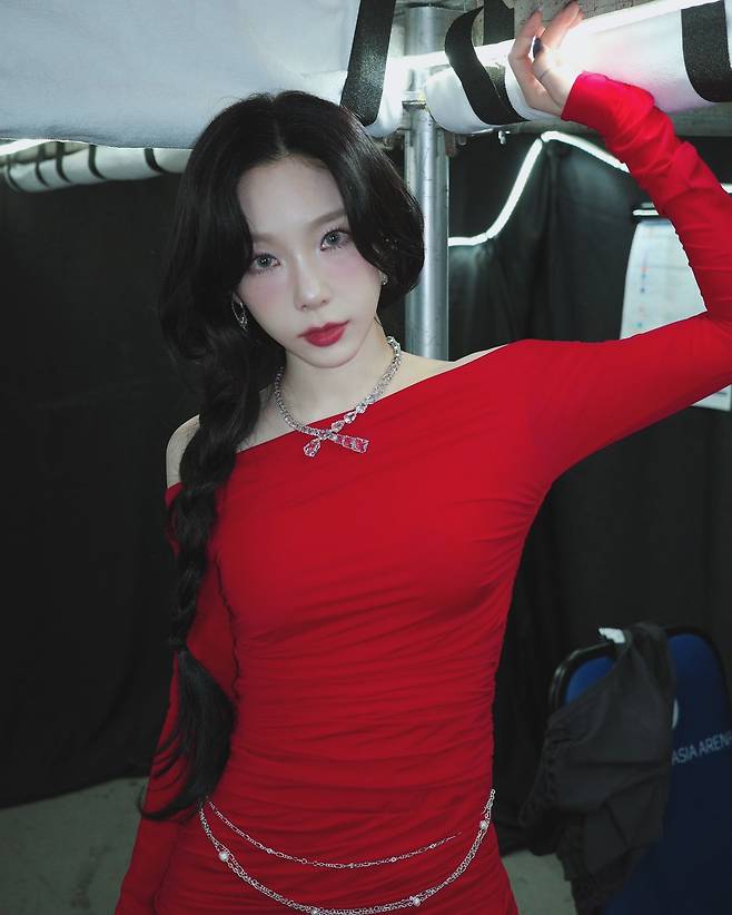 그리고 마지막, 태연 시그니처 컬러처럼 느껴지는 강렬한 레드 드레스는 오프숄더 실루엣과 체인 벨트 디테일로 섬세함을 더했어요.