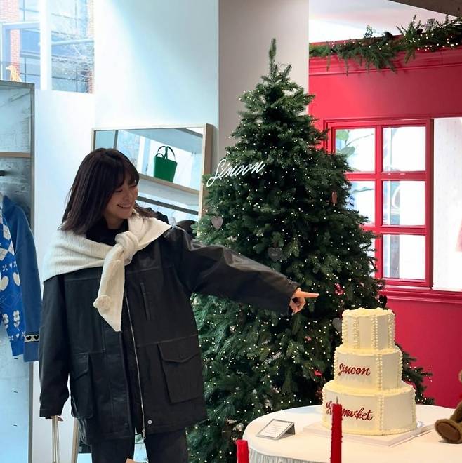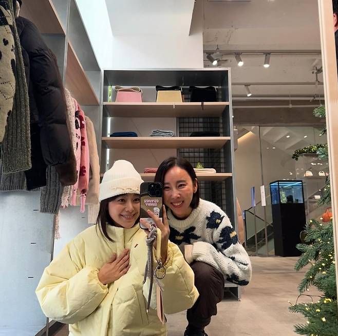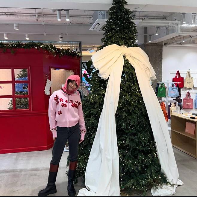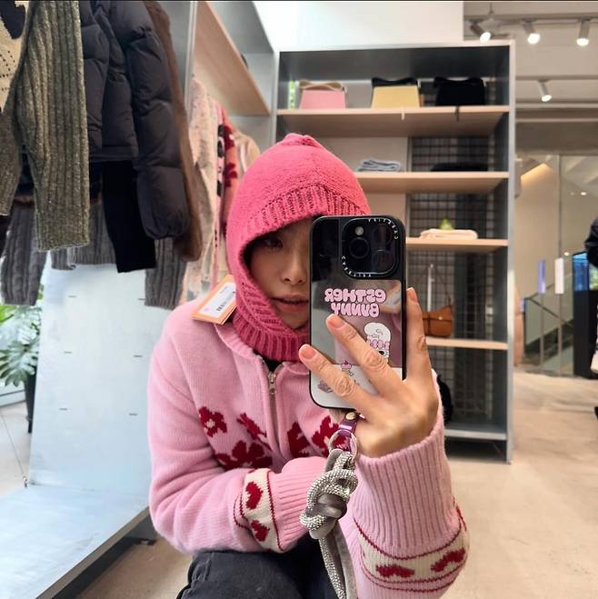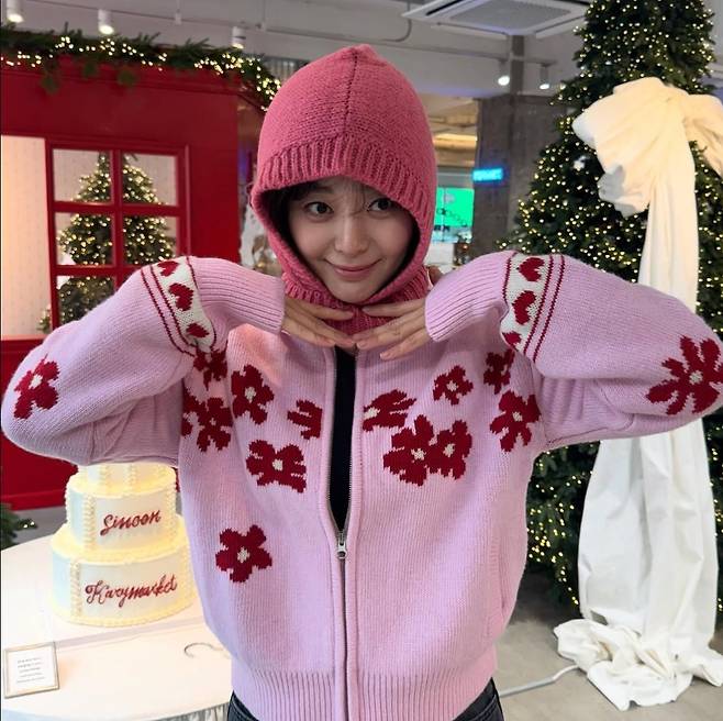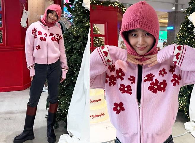 이영은은 꽃 패턴이 돋보이는 핑크 니트 집업을 착용해 밝고 러블리한 분위기를 연출했습니다.