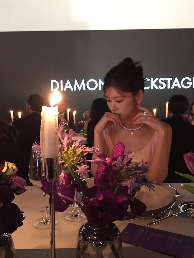 매끈하게 올려 묶은 번 헤어에 가느다란 앞머리가 더해져 여리여리한 분위기를 살려줬고, 목선을 따라 정갈하게 감긴 다이아몬드 목걸이는 고급스러움의 정점을 찍었죠.