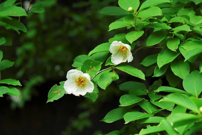 6~7월에는 동백꽃과 비슷하게 생긴 하얀 꽃을 피우며, 이 꽃은 새로 자란 가지 끝에 달린다. 꽃잎은 5~6개이며, 꽃받침은 둥글고 융모가 있다.