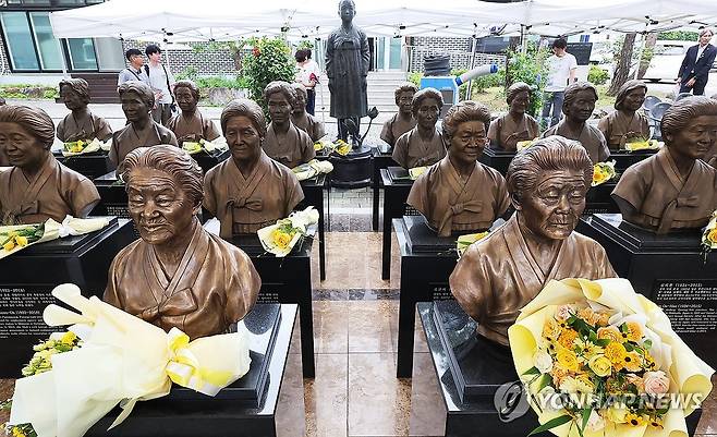 (경기 광주=연합뉴스) 홍기원 기자 = 9일 경기도 광주시 나눔의집에서 열린 '2025년 일본군 위안부 피해자 기림의 날' 기념식에서 지난해 별세한 박옥선 할머니와 올해 별세한 이옥선 할머니의 흉상이 세워져 있다. 2025.8.9