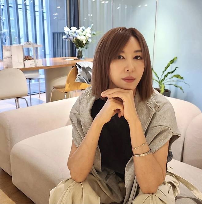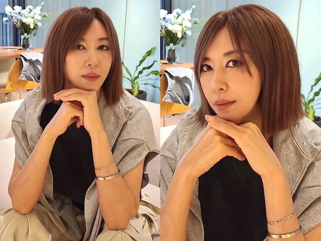 김완선은 턱선을 따라 정교하게 떨어지는 칼단발 스타일로 세련된 분위기를 한껏 끌어올렸습니다.