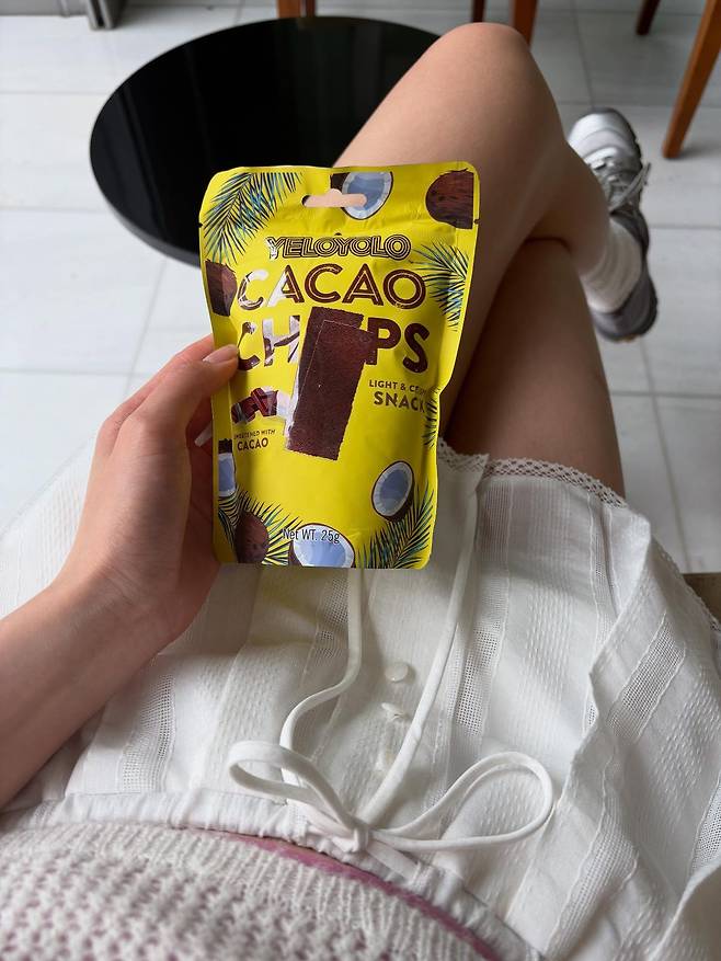 손에 든 초콜릿 스낵과 캐주얼한 스니커즈까지, 사소한 디테일 하나까지도 자신의 감각으로 소화하는 모습이 인상적이에요.