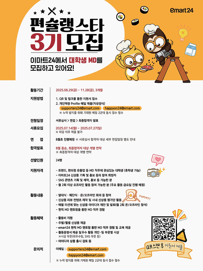 편스타 3기는 오는 14일(월)부터 27일(일)까지 모집하며 구글폼 링크 또는 이마트24 공식 인스타그램에 게시된 QR 링크를 통해 지원 동기를 비롯한 인적사항을 기록하고, 개인 포트폴리오 등은 메일로 제출하면 된다.