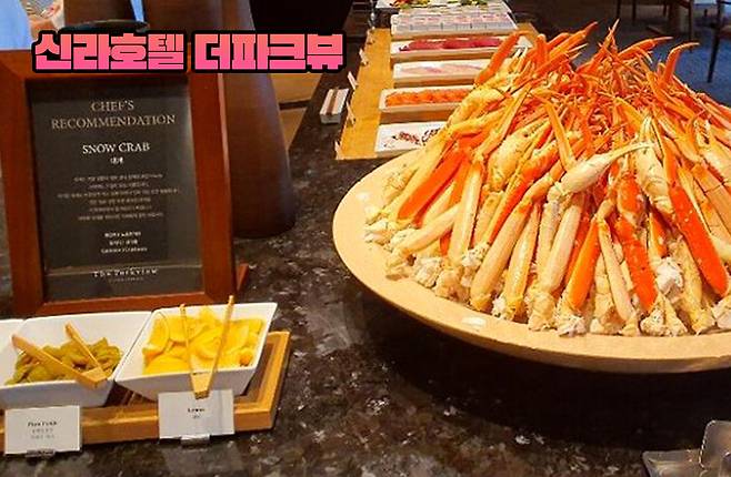 맛있는 조식으로도 유명한 신라호텔 더파크뷰. 이곳은 서울의 3대 뷔페 중 하나로 꼽히죠! 더파크뷰의 대표 메뉴는 바로 대게인데요. 신선하면서도 짜지 않아 폭풍먹방이 가능하다니까요. 호홍.