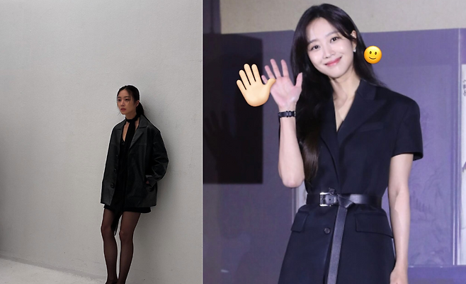 오버사이즈 블랙 재킷을 활용한 미니멀 스타일링으로 도시적인 세련미를 표현하고 있다. 블랙 톤온톤 코디네이션에 검은 스타킹과 로퍼를 매치해 모노크롬의 완성도 높은 룩을 연출하고 있다. 깔끔하게 정리된 헤어와 함께 모던하고 시크한 이미지를 완성하고 있다.