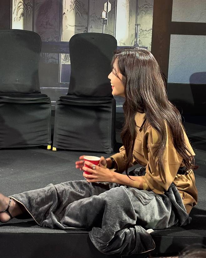 조보아는 편안한 베이지 톤 블라우스와 그레이 와이드 팬츠로 자연스러운 휴식 룩을 연출하고 있다. 무릎 담요를 덮고 있는 모습에서 일상적이면서도 세련된 캐주얼 스타일링을 보여준다. 긴 헤어를 자연스럽게 흘린 스타일링이 전체적인 편안함을 강조하고 있다.