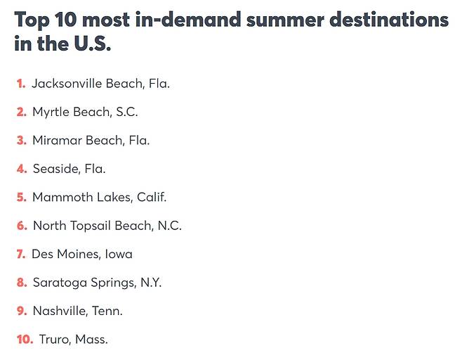 이외에도 2023년 미국에서 가장 인기가 많았던 휴양지들은 플로리다의 시사이드, 캘리포니아의 매머드 레이크, 노스캐롤리아의 노스 탑새일 비치가 뒤를 이었습니다.