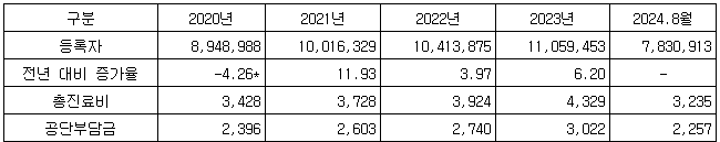 2021년 1천1만6천329명으로 처음으로 1천만명을 돌파한 데 이어 2022년 1천41만3천875명, 2023년 1천105만9천453명 등으로 증가 추세다. 올해는 8월 기준으로 783만913명이었다.