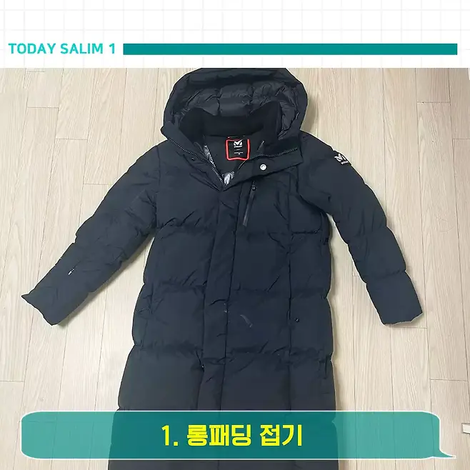 끝! 처치 곤란인 롱패딩 하나랑 손만 있다면 누구나 작게 접을 수 있어요. 한번 시작해볼게요.