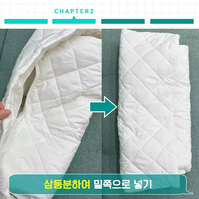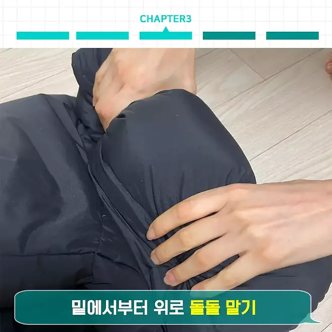 그리고 3등분으로 패딩을 접어서 바닥 부분에 윗부분을 쏘옥 끼워주세요. 낀 후 바람을 쭈욱 빼서 얇게 만들어줍니다. 이렇게만 해도 1/3 크기로 줄어들었죠? 하지만 더 작아질 수 있는 방법이 있는데요.
