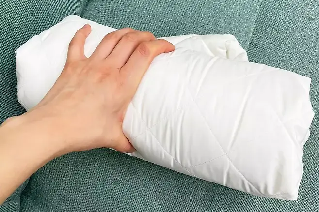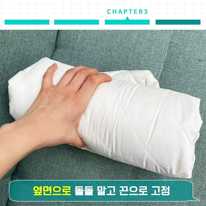 그다음 옆면을 김밥처럼 돌돌 말고 끈으로 묶어주면 끝! 마땅히 묶을 끈이 없으면 고무줄로 해도 되는데, 고무줄이 너무 짱짱하면 쉽게 끊어지니 주의. 조금 늘어난 고무줄을 사용해야 패딩도 안 상하고, 고무줄도 안 끊어지고 좋답니다.