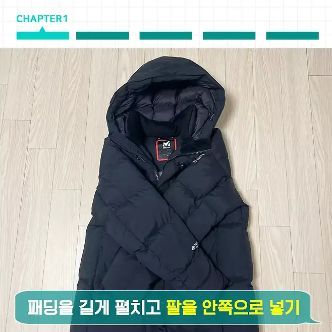 첫 번째 방법입니다. 패딩을 길게 펼쳐요. 그리고 팔을 안쪽으로 착착 접어줍니다.