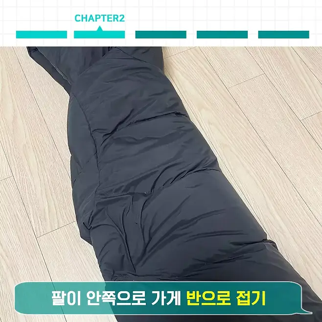 그리고 그대로 팔이 안쪽으로 가게끔 반 접어줘요. 이렇게 접을 때는 패딩 속 바람이 잘 빠질 수 있도록 꾹꾹 눌러서 접어줘야 해요.