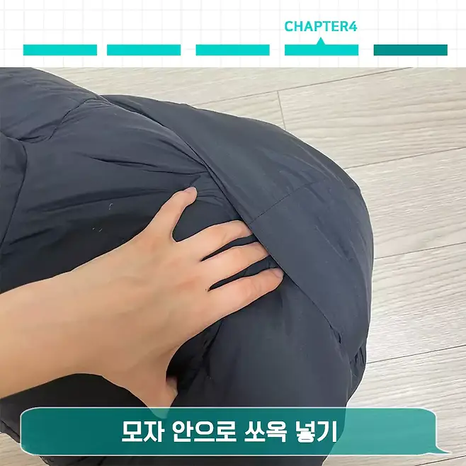 돌돌 말아서 모자에 쏙~ 넣어주면 끝. 만약 패딩에 모자가 없다면 끈으로 꽉 묶어주세요.