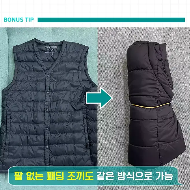 팔이 없는 패딩 조끼는 어떻게 접을 수 있냐고요? 보너스 팁으로 바로 보여드릴게요.