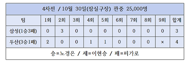 마지막 타자 구자욱의 타구를 유격수 김재호가 잡아 역동적으로 1루로 던지면서 두산의 4-3 승리가 마무리됐다. 한국시리즈 1차전과 3차전에서 1.1이닝씩 던졌지만 세이브를 올리지 못하던 이현승은 4차전에서 1.2이닝 무실점으로 데뷔 첫 한국시리즈 세이브를 따냈다.
