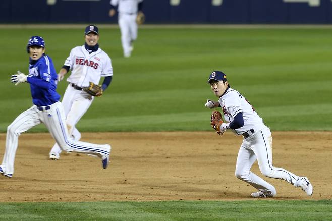 여기서 9번타자 김상수가 때린 공은 3·유간 땅볼. 3루수 허경민이 글러브를 뻗어 낚아챘다. 타구 속도나 방향을 봤을 때 더블플레이를 시도하기엔 애매했다. 그런데 이때 허경민이 홈 방향으로 몸을 비틀면서 정확히 송구해 3루주자를 잡아냈다.