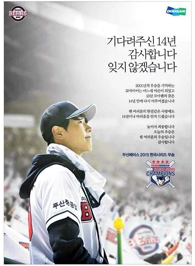 “2015년 두산이 챔피언이 됩니다. 14년 만에 미러클 두산이 또 한 번 가을의 기적을 완성하는 순간입니다!”