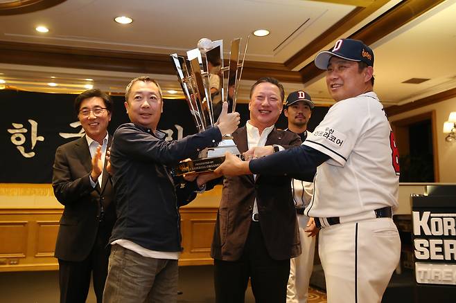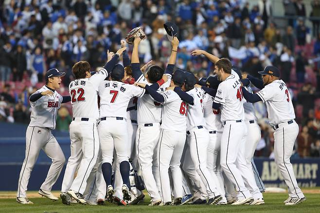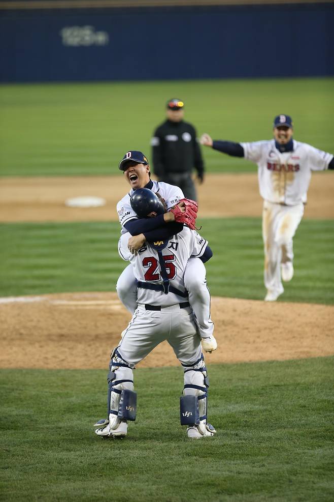 양의지가 두 팔을 벌려 마운드로 달려 나가자 어린아이처럼 껑충껑충 뛰며 포효하던 이현승이 양의지 품으로 뛰어올라 뜨겁게 포옹했다. 초보 사령탑으로서 첫해부터 한국시리즈 우승의 역사를 쓴 김태형 감독은 덕아웃에서 OB 베어스 시절의 대선배 유지훤 수석코치를 끌어안았고, 두산 선수들은 미친 듯이 그라운드로 달려나갔다.