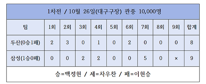 10월 26일 대구구장에서 1차전이 시작됐다. 보통 1차전은 탐색전이라고 하지만 첫판부터 17점이 오가는 난타전으로 전개됐다.