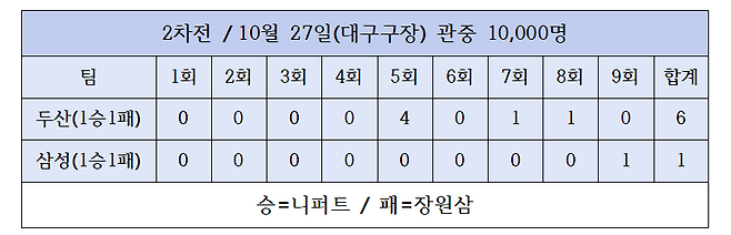 두산은 1차전에서 초반 대량 득점에도 불구하고 삼성에 역전패를 당한 바 있다. 그래서 결코 방심할 수 없었다. 그러나 1차전과 다른 점은 마운드에 니퍼트가 버티고 있다는 사실. 니퍼트는 삼성 타선을 압도했다. 바늘구멍조차 허락하지 않았다. 7이닝 3피안타 2볼넷 5탈삼진 무실점으로 한국시리즈 무대 개인통산 첫 승을 올렸다. 아울러 이날까지 포스트시즌 24.1연속이닝 무실점으로 2013년 유희관이 작성한 기록(20.2연속이닝 무실점)을 넘어 이 부문 신기록을 작성했다.