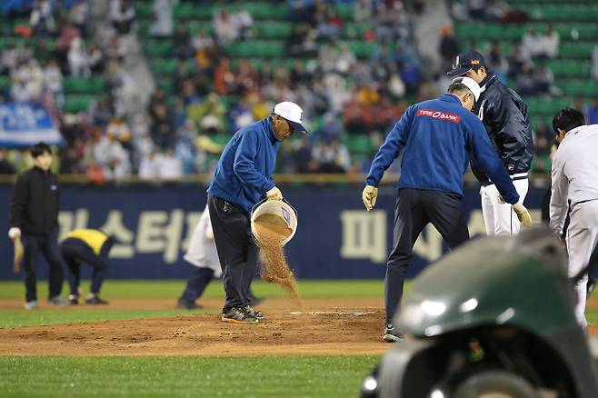 29일 잠실구장에서 펼져진 3차전. 가을비치고는 꽤 많은 양의 비가 내렸다. 2차례에 걸쳐 총 52분간이나 경기가 중단됐을 정도였다.