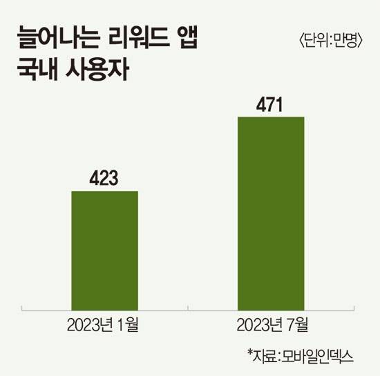 하지만 앱테크 기능 자체가 메인이 되는 앱도 많다. 바로 ‘리워드 앱’ 카테고리에 속하는 앱들이다. 앱테크만을 위한 ‘특화 앱’이라고 보면 쉽다. 리워드를 지급하는 대신 이용자 광고 노출로 수익을 꾀하는 방식이다. 리워드 앱 사용자 수는 최근 더욱 빠르게 늘어나고 있다. 앱 데이터 분석 플랫폼 ‘모바일인덱스’에 따르면 리워드 앱 카테고리 월간 순 사용자 수(MAU)는 올해 1월 423만명에서 7월 471만명까지 늘었다.