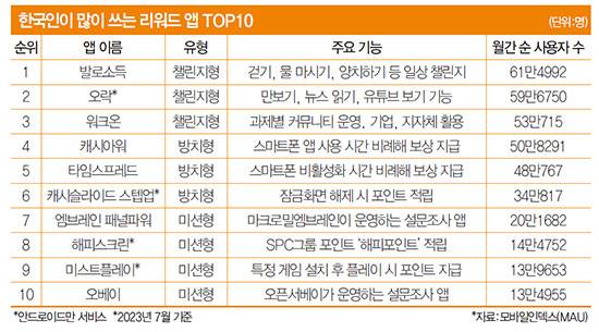 순위표에서 가장 눈에 띄는 건 역시 ‘챌린지형 리워드 앱’이었다. 사용자가 특정 도전 과제를 달성하면 보상을 주는 앱이다. 가장 대표적인 과제가 ‘걸음 수’다. 예를 들어 하루 1만걸음 이상 걸으면 포인트를 적립해주는 방식이다. 따로 시간을 들일 필요가 없는 데다 생활 습관까지 개선할 수 있는 덕분인지 사용자가 가장 많았다. 상위 10개 리워드 앱 중 1위부터 3위까지 모두 챌린지형 앱이 차지했다.