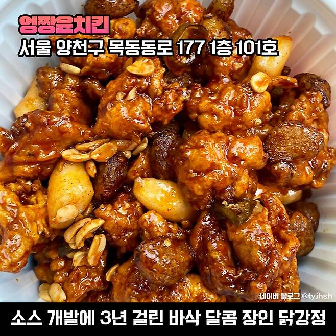 엉짱윤 치킨은 언제 시키더라도 바삭한 튀김과 감칠맛이 확 나는 닭강정을 맛볼 수 있어요.특히 고소한 견과류가 한 가득 뿌려져 나오기 때문에 맥주 안주로도 최고랍니다. 되면 좋고 안돼도 그만~긍정적인 마음으로 한 번 도전! 어떠신가요. ㅎㅎ