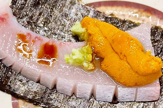 대방어 회를 시키면, 고급 참치 회 세트처럼, 다양한 부위들이 한 세트로 나오고, 기본 찬으로 나온 갈치속젓과 표고 와사비 등에 싸 먹다 보면 어느새 한 접시 뚝딱이랍니다.