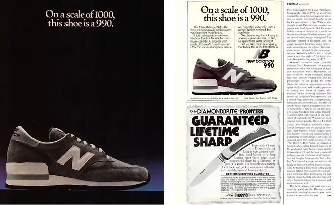 뉴발란스 990은 1982년, 첫 모델인 v1 발매 당시 100달러에 육박하는 높은 발매가를 기록했습니다. 당시 인기가 가장 높았던 자사 제품 320이 32달러였던 점을 감안하면 약 3배 수준이고, 뉴발란스 내부에서는 고가이기에 판매 되지 않을 수 있다는 우려도 있었다고 합니다. 이런 걱정들을 날려 버리듯이 990v1은 6개월 만에 5만 족 이상 판매 되었습니다. 수작업으로 제작하였기에 예약 주문까지 걸려 있었다고 하네요.